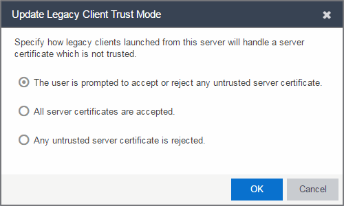 Use this window to update the client certificate trust mode that specifies how ExtremeCloud IQ Site Engine legacy java application clients handle the server certificates they receive. This option is only applicable if you use legacy java applications. Access this window from the Administration > Certificates tab.