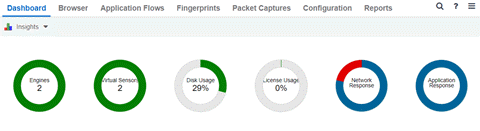 Six ring charts display real-time Engines, Virtual Sensors, Disk Usage, Flow Rate, Network, and Application usage and service data: