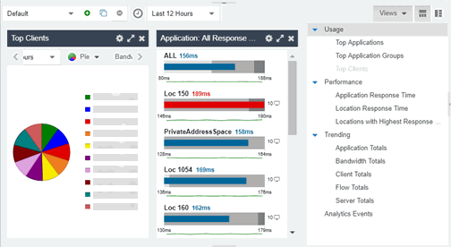 - Application Response — The colors in the graph indicate the application response time for the application/site. Hover over a ring color to display a tooltip with response time details and the number of applications within the expected response time range. Select a color in the graph to open the Response Time dashboard, which displays network and application response time charts and details.