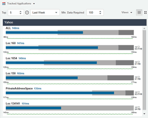 The Tracked Application dashboard displays the performance (in response time) of your network for applications you configure in the Tracked Applications field on the Analytics > Configuration > Configuration tab.