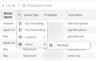 Note: The End-Systems Table can be filtered for negative values. To filter a column in the End-systems Table for a negative value, select the down arrow in the column heading to open the filter drop-down list. Select Filters and add the word or value for which you want to filter and add an exclamation point symbol (!) at the start of the search word.