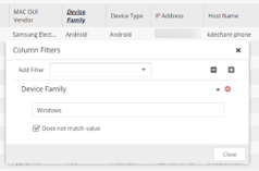 For example, if you are searching for all the rows in the in the Device Family column that do not contain a "Windows" string, enter "!Windows" in the search value field. See the image below: