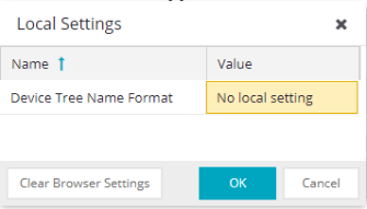 - Settings — Selecting the Settings link on the top right of the Network tab opens the Local Settings window, shown below, from which you can select how the Device navigation tree displays the name of your devices using the Device Tree Name Format drop-down list.