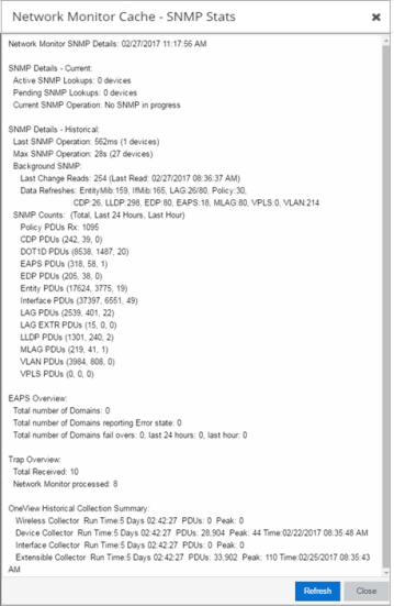 - Select the Network Monitor SNMP icon at the bottom right corner of the window to open the Network Monitor Cache - SNMP Stats window. This displays the current and historical SNMP (Simple Network Management Protocol) details as well as EAPS, Trap, and ExtremeCloud IQ Site Engine Historical Collection Summary statistics. Select the Refresh button to refresh the information in the window.