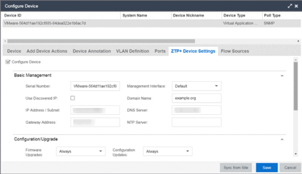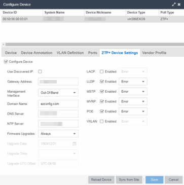 - Configure the fields on the ZTP+ Device Settings tab to determine how the device is managed by ExtremeCloud IQ Site Engine using ZTP+ functionality.