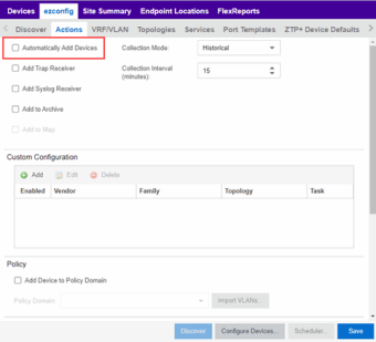 Select the Automatically Add Devices checkbox in the Discovered Device Actions section and any other actions you want to occur on your devices discovered in ExtremeCloud IQ Site Engine.