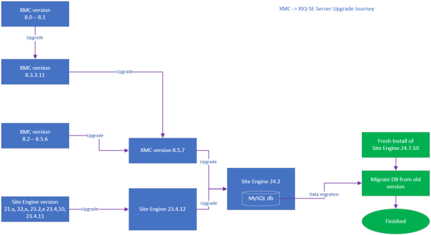 The following flowchart shows the supported upgrade paths for a data migration to ExtremeCloud IQ Site Engine version 24.7: