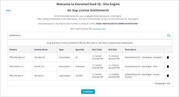 - Air Gap mode - Enter entitlement(s) for air gapped ExtremeCloud IQ Site Engine - In air gap deployment mode, ExtremeCloud IQ Site Engine utilizes these licenses based on a license file. During the generation of the license file, the licenses are assigned to the locking ID of ExtremeCloud IQ Site Engine.