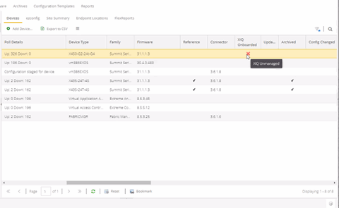 - Red X - Indicates the device is onboarded but Unmanaged, which means it is not using a license, it has read-only device-level support, and available features in ExtremeCloud IQ Site Engine are limited.