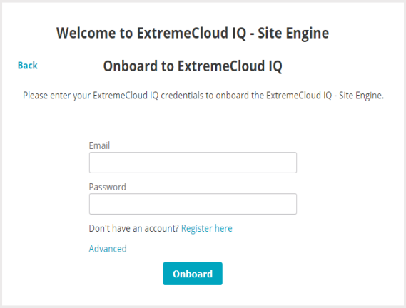 If your environment requires HTTP Proxy or other advanced settings, select the Advanced link. If you do not have an ExtremeCloud IQ account, select the Register Here link.