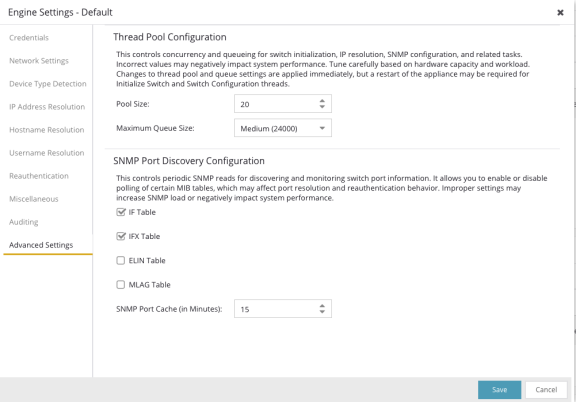 Use this tab to configure advanced settings for your ExtremeControl engine, such as Thread Pool and SNMP Port Discovery.