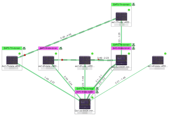 — Indicates one or more of the domains is not operational (the device's master domain is in a failed state or a transit node is in a "links down" state) - Grey — Indicates the EAPS domain is disabled
