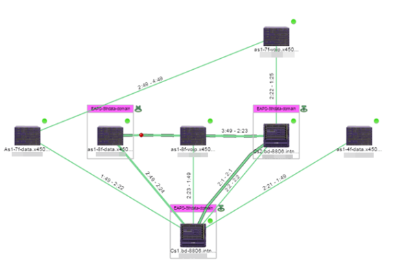When selecting an EAPS domain, link information is also displayed. A single green line means a link that is not shared, while a dashed line between devices means the link is shared. A red dot icon on a shared link indicates the secondary link is blocked.