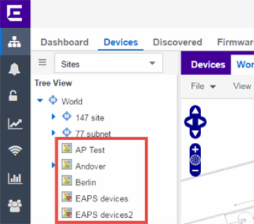 As you create your maps, they appear in the Network > Devices tab navigation tree by selecting Sites, nested under the map you configure as the Parent Map.